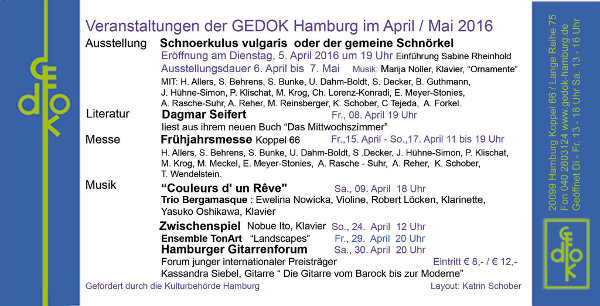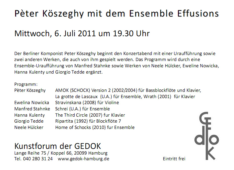 Am 06.07.2011 um 19:30 Uhr findet das Konzert des Ensembles Effusions in der Gedok Galerie Hamburg statt.