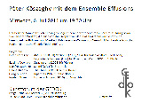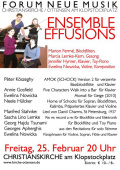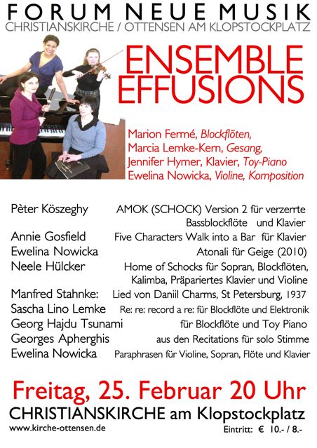 Ensemble Effusions spielt die Musik von: P.Koszeghy, A. Gosfield, N. Hülcker, M. Stahnke, S. L. Lemke, G. Hajdu, G. Apherghis und E. Nowicka.