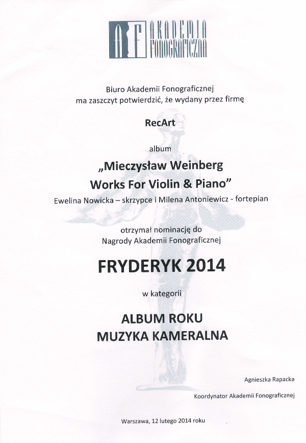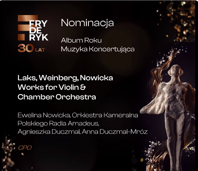 Meine neue CD mit der Musik von Simon Laks, Mieczysław Weinberg und Ewelina Nowicka wurde für den polnischen Fryderyk Preis 2024 in der Kategorie "Album des Jahres - Konzertmusik" nominiert.