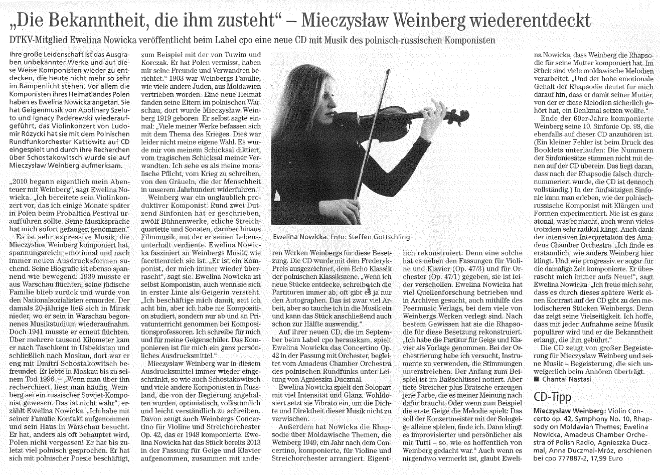 Im August wird ein Interview in der Zeitschrift "Muzyka 21" über Entdeckung den Violinkonzerten von Ludomir Rozycki und Mieczyslaw Weinberg erscheinen.
