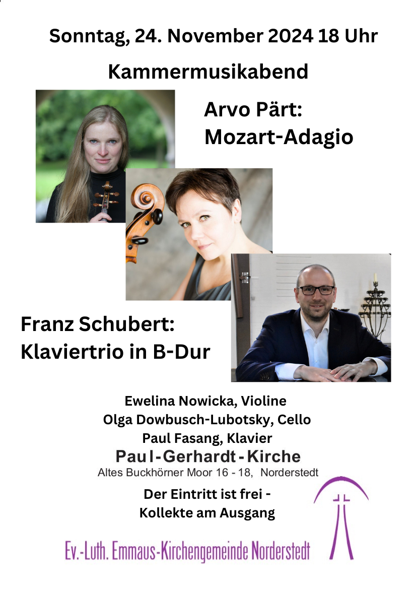 Am 24.11.24 werde ich zusammen mit Paul Fasang und Olga Dowbusch-Lubotsky Klaviertrio B-Dur von Franz Schubert spielen.