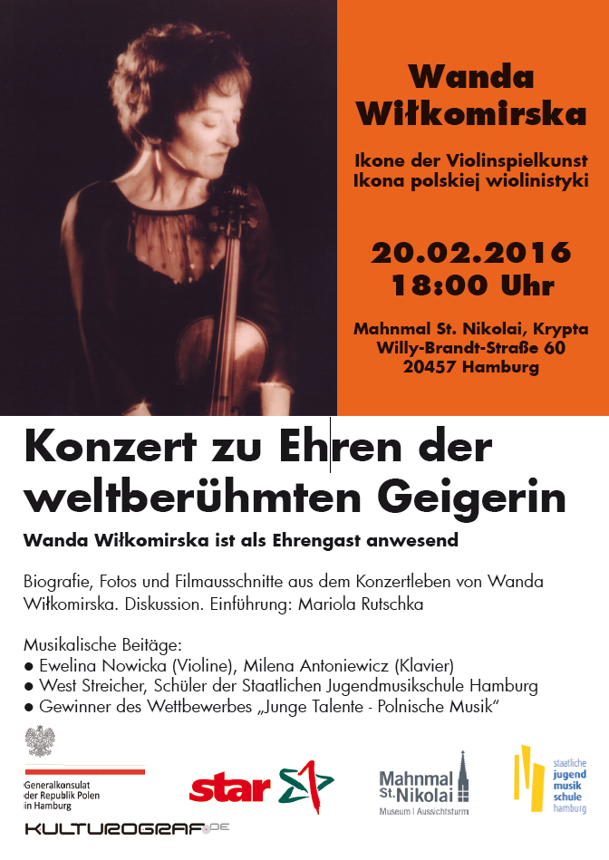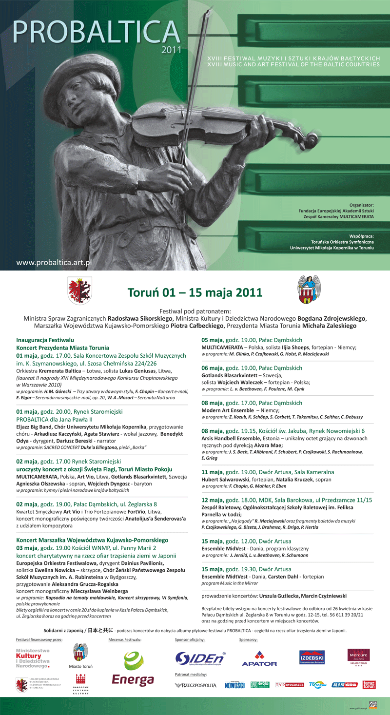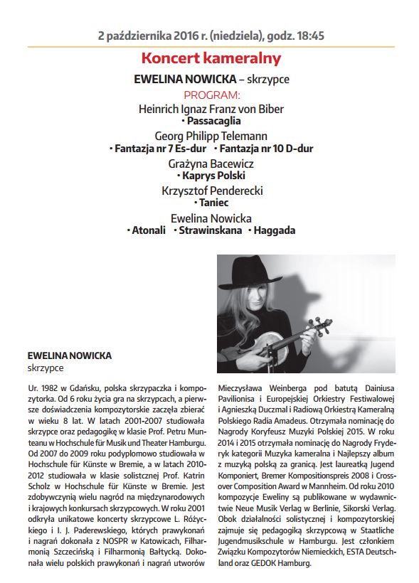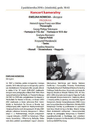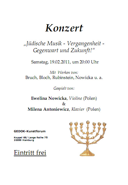Am 01.05 bis zum 15.05.2011 findet in Thorn, Warschau und Grudziadz das Probaltica Festival statt. Dieses Jahr wurde ich eingeladen das Violinkonzert von Mieczyslaw Weinberg mit dem Festival Orchester unter der Leitung von Dainius Pavilionis zu spielen. Am 25.02.2011 um 20:00 Uhr findet das Konzert des Ensembles Effisions in der Ev. Luth. Kirchengemeinde Ottensen statt. Jennifer Hymer (Klavier, Toy Piano), Marcia Lemke-Kern (Sopran), Ewelina Nowicka (Violine), Marion Fermé (Blockflöten) Am 19.02.2011 um 20:00 Uhr in der Galerie Gedok findet das Konzert "Jüdische Musik - Vergangenheit, Gegenwart und Zukunft!" von Milena Piszczorowicz (Polen) und Ewelina Nowicka statt.