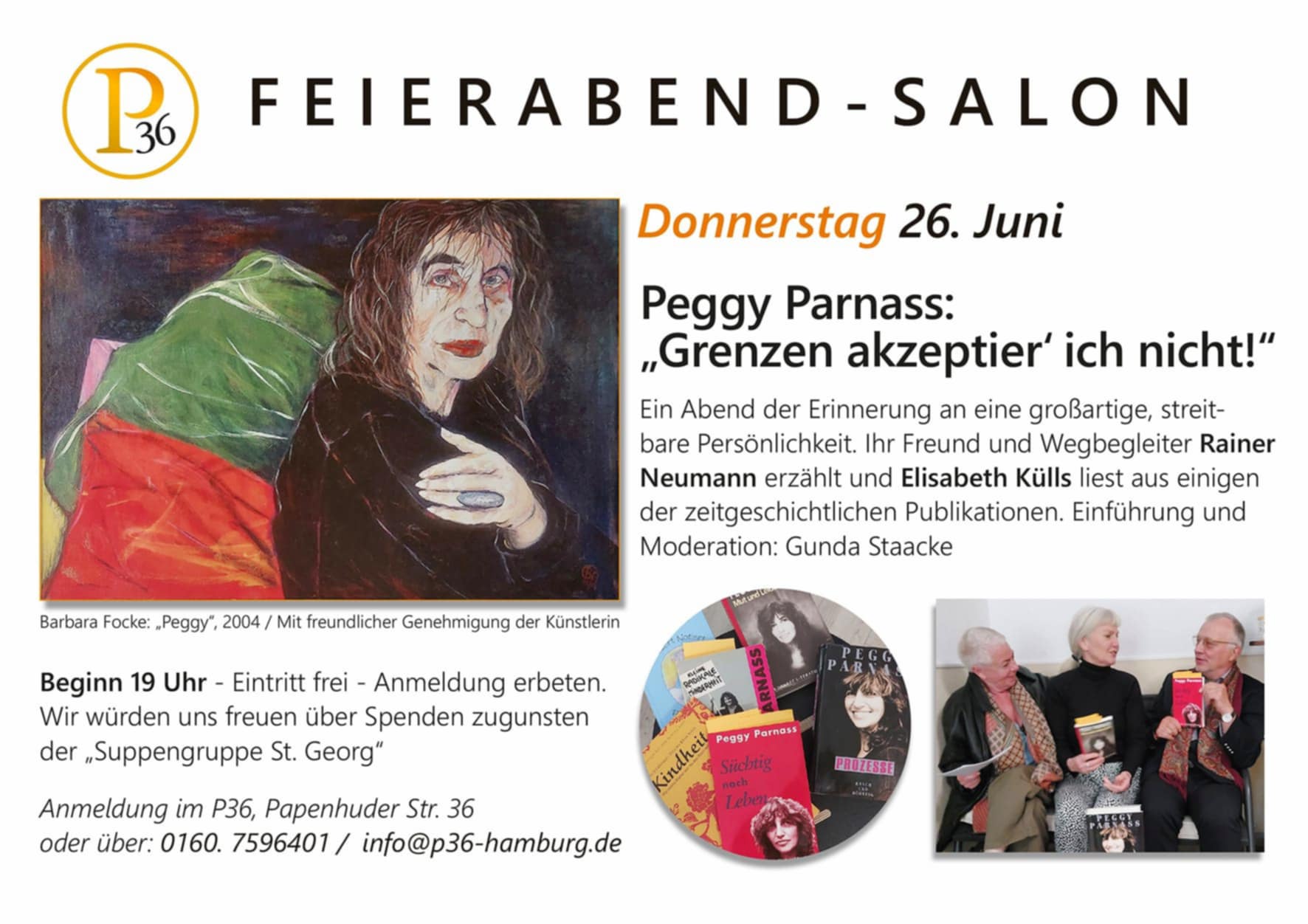 los. Der Eintritt ist frei. Eine Spende zugunsten der St. Georger Suppengruppe wird gern entgegen genommen. Da es nur begrenzt Plätze gibt, ist eine Anmeldung für diesen Abend im P36 in der Papenhuder Straße 36 erforderlich:
