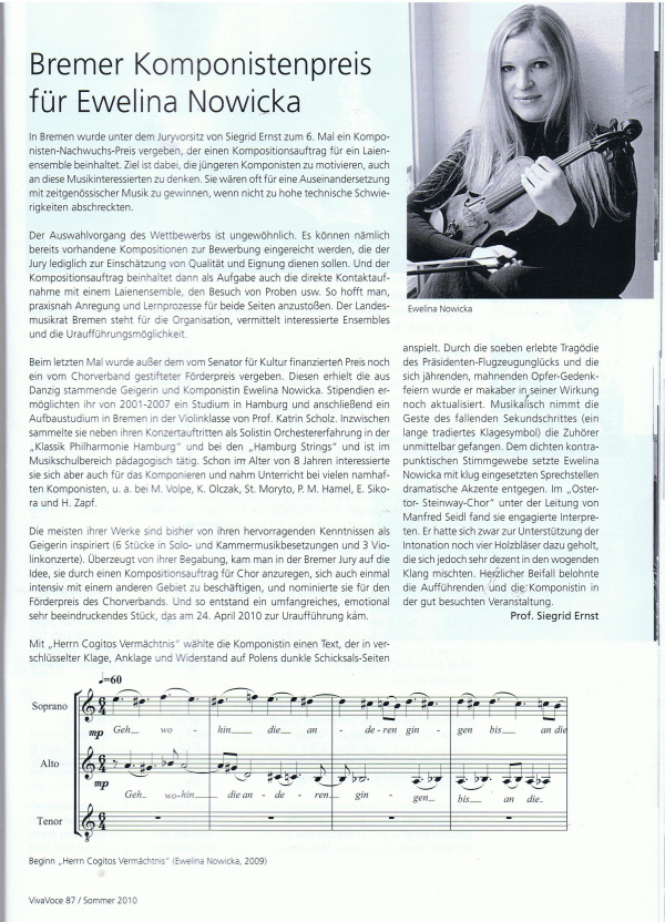 In der Zeitschrift VivaVoce ist der folgende Konzertbericht von Prof. Siegrid Ernst erschienen. Sie beschreibt dort u.a. auch meinen Beitrag zum Bremer Komponistenpreis, was mich sehr überrascht und nochmehr erfreut hat :)
