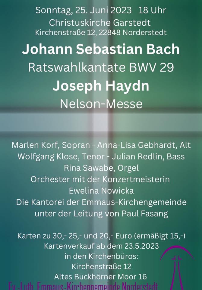 Am 25.06.2023 um 18:00 Uhr findet in der Christuskirche in Norderstedt ein Orchesterkonzert zusammen mit dem Chor der Kantorei der Emmauskirchengemeinde statt. Dieses Mal spiele ich dort als Konzertmeisterin mit und freue mich über das schöne Konzertprogramm mit den Werken von J.S. Bach und J. Haydn.