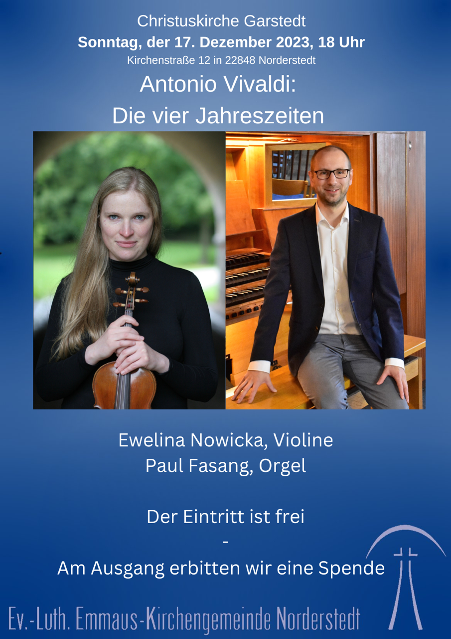 Den 17.12.2023 um 18Uhr werde ich zusammen mit Paul Fasang (Orgel) Vier Jahreszeiten von Antonio Vivaldi spielen.