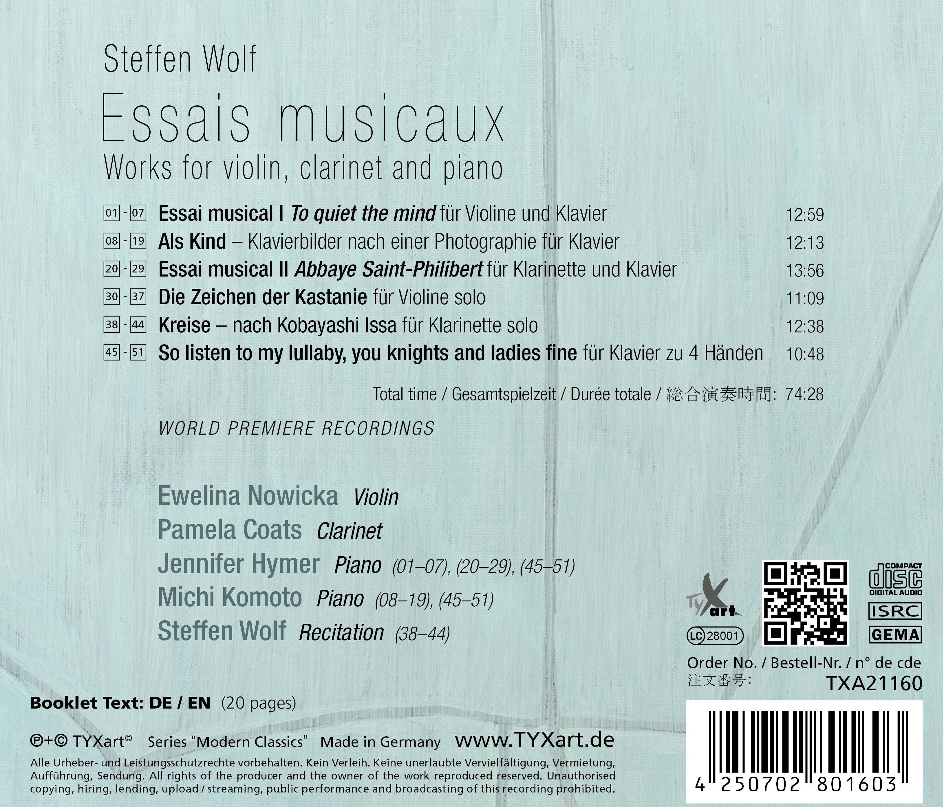 Neue CD mit den Werken für Violine, Klavier und Klarinette von Steffen Wolf ist erhältlich. Die CD wurde von Label Tyxart herausgegeben.