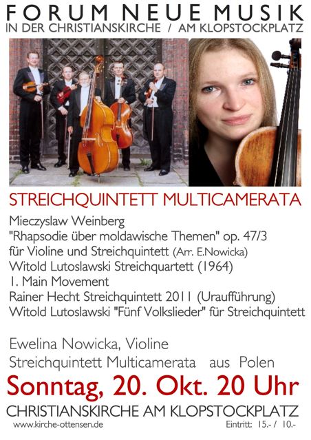W dniach od 01.05 do 15.05.2011 odbędzie się w Toruniu, Warszawie i Grudziądzu Festival Probaltica. W tym roku zostałam zaproszona by zagrać koncert skrzypcowy Mieczysława Weinberga z orkiestrą festiwalową pod dyrekcją Dainiusa Pavilionisa. 25.02.2011 o godzinie 20:00 odbędzie się koncert Ensemble Effisions w kościele ewangelicko - luteranskim w hamburgu - Ottensen. Wystąpią: Jennifer Hymer (fortepian, toy piano), Marcia Lemke-Kern (sopran), Ewelina Nowicka (skrzypce), Marion Fermé (flety proste) 19.02.2011 o godzinie 20:00 w galerii Gedok w Hamburgu odbędzie się koncert z mottem: "Muzyka Żydowska - przeszłość, terazniejszość i przyszłość!" na którym usłyszycie państwo Milenę Piszczorowicz (Polska) i Ewelinę Nowicką.